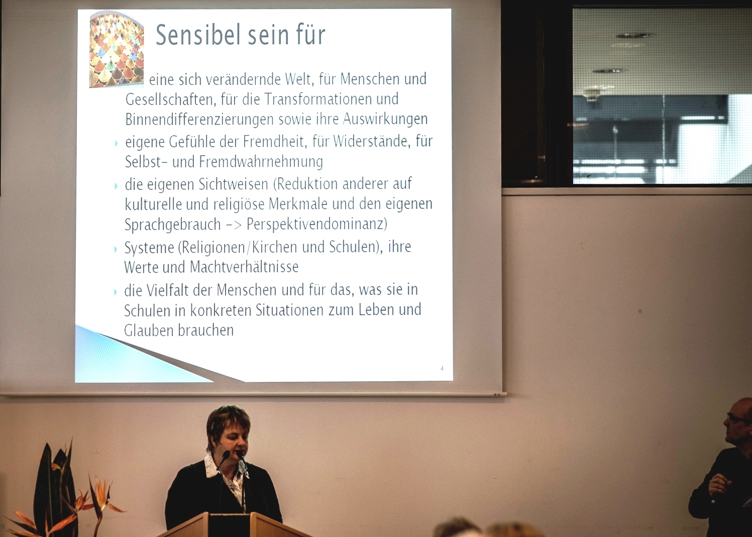Aus schulpädagogischer Perspektive ging die an der Universität Osnabrück tätige Dr. Susanne Müller-Using auf die multikulturelle Situation von Schule ein und appellierte dafür, von den Kinder- und Menschenrechten her die pädagogischen Leitlinien in den Schulen auszurichten. So ergebe sich die Chance, die Verschleierung der strukturellen Benachteiligung von Kindern und Jugendlichen mit Migrationshintergrund ebenso zu überwinden wie eine unreflektierte Ausübung von Macht. In der Aus- und Fortbildung müsse die Entwicklung einer interkulturellen Kompetenz, die Wissen, Haltungen und Handeln einbeziehe, einen größeren Stellenwert bekommen.
