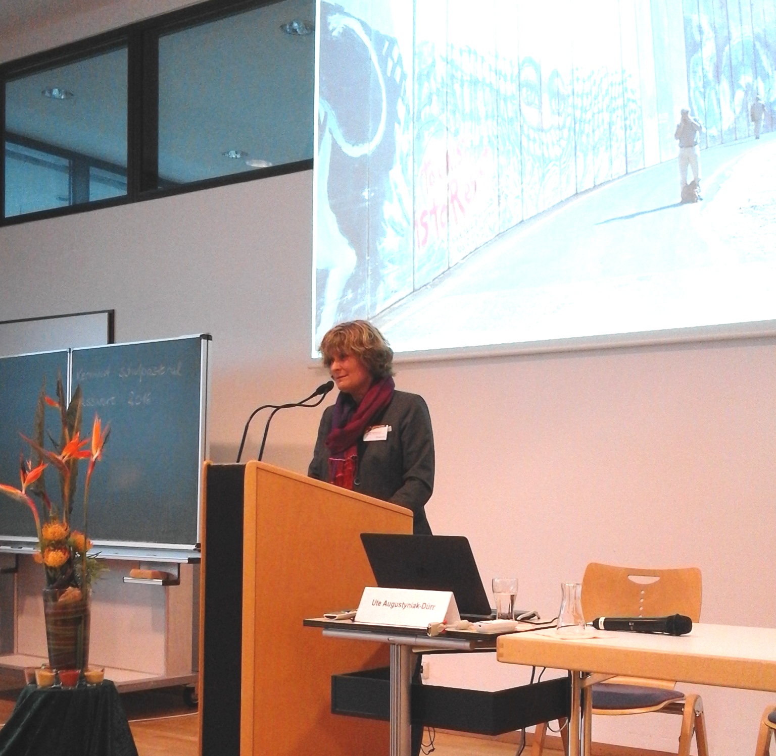Ebenfalls erfahrungsbezogen gestaltete die Ordinariatsrätin der Diözese Rottenburg-Stuttgart, Ute Augustyniak-Dürr, den Einstieg in den zweiten Tag des Kongresses durch einen Perspektivenwechsel. Sechs Jahre hatte sie mit ihrer Familie an der Grenze zu Israel in Palästina Erfahrungen in einer fremden Kultur gesammelt. Daraus hat die Leiterin der Hauptabteilung Schulen einen „interkulturellen Code“ entwickelt: Für das Gelingen der Begegnungen seien vor allem das gegenseitige Interesse und eine wechselseitige Wertschätzung, Respekt und eine Dankbarkeit von großer Bedeutung. Zu den zentralen Aufgaben der Schulpastoral zählt aus ihrer Perspektive das Bemühen, Menschen auf dem Hintergrund ihrer Lebenswelt zu verstehen und friedensstiftend zu wirken.