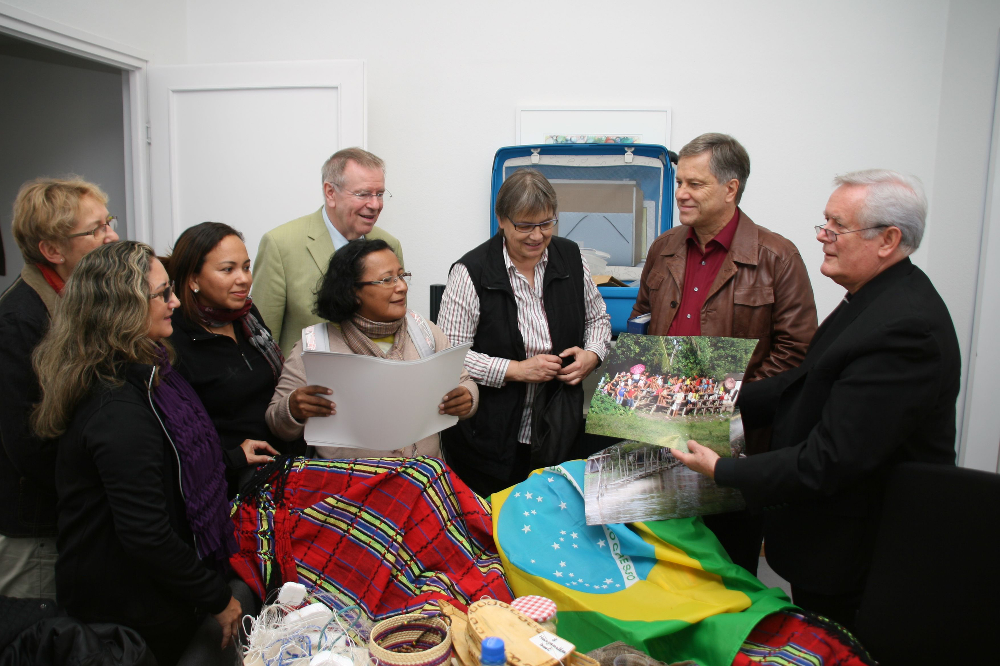 An dem Termin nahmen die Gäste aus dem Partnerbistum Ana de Lourdes Alves Figueira, Janirene da Silva e Souza und Shirley Nazimone de Souza Mendes teil. Begleitet wurden sie von Christiane Hetterich vom Referat Mission-Entwicklung-Frieden des Bistums Würzburg und Diözesanratsvorsitzendem Karl-Peter Büttner. Zu finden sind im Koffer unter anderem 19 großformatige Fotos, die typische Szenen aus der brasilianischen Partnerdiözese zeigen, eine Landkarte des Bundesstaates Pará, eine DVD über den Besuch des Diözesanrats in Óbidos und ein Beutel mit Maniokmehl, dem Grundnahrungsmittel der Gegend. Enthalten sind zudem je ein getrockneter Piranha und ein Amazonas-Speisefisch sowie eine Hängematte und ein Holzmodell eines landesüblichen Reisebootes. „In einem Materialordner haben wir Texte und Bilder als Unterrichtsmaterial und Kopiervorlagen zusammengestellt“, erklärte Geißler. Der Óbidos-Koffer kann von Lehrkräften, Mitarbeitern der kirchlichen Jugendarbeit und pastoralen Kräften beim Katechetischen Institut in Würzburg, Ottostraße 1, Telefon 0931/38663601, ausgeliehen werden. Einen ähnlichen Koffer gibt es für das tansanische Partnerbistum Mbinga.