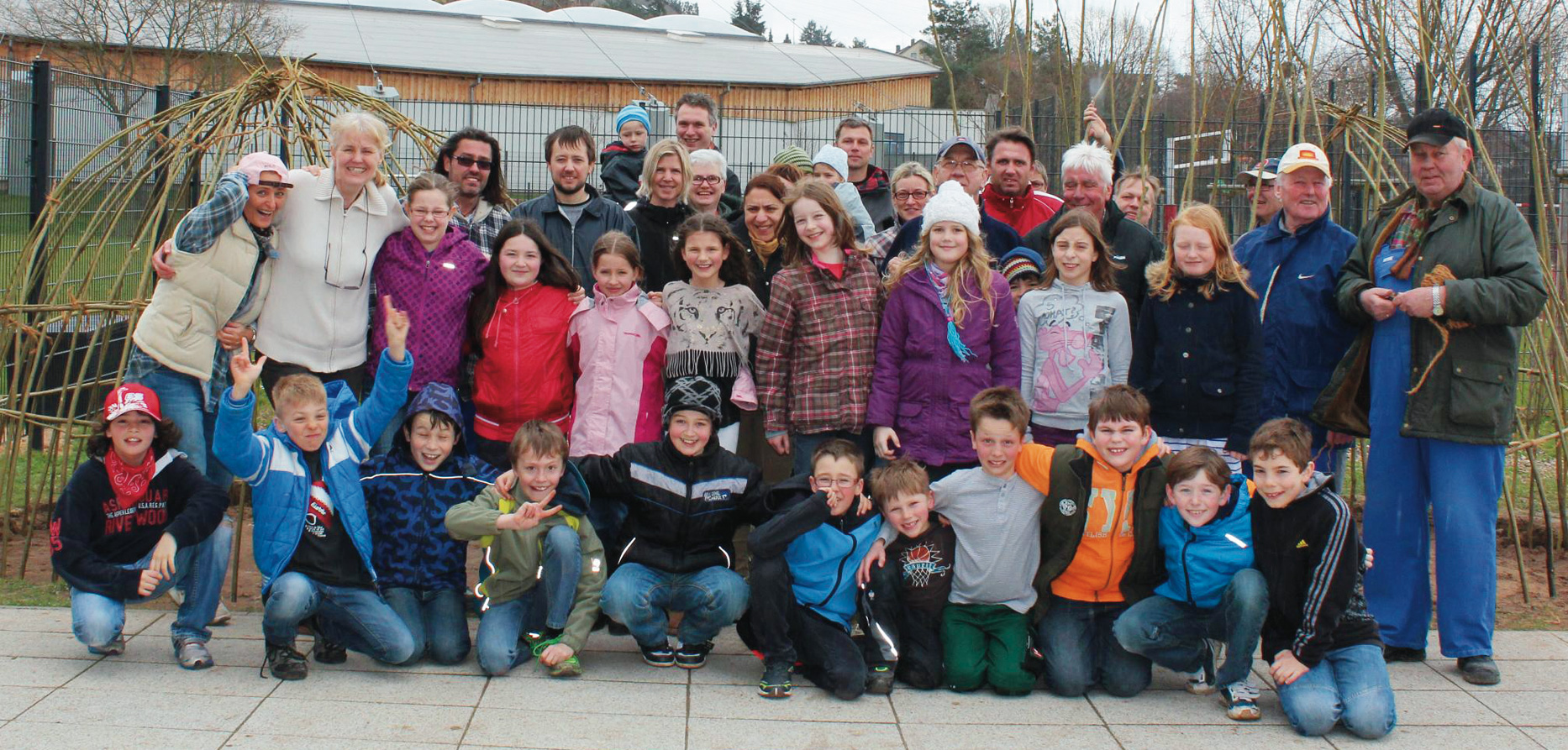 Mit insgesamt 60 Männer, Frauen und Kindern waren sie einen Samstag lang zugange, zeichneten den Grundriss vor, hoben die Erde aus, pflanzten Weidenruten und banden sie oben zusammen. Ganz schön viel zu tun für die kleinen und großen Helfer. Zum Glück stellte der Elternbeirat der Schule zur Kräftigung der Arbeiter das Essen und Trinken zur Verfügung. Jetzt müssen die Weiden nur noch Wurzeln schlagen und aus den Ästen soll ein Blätterdach wachsen, dann ist auf dem Schulhof ein schattiger Ort zum Spielen und Spaß haben entstanden. Erste Triebe lassen Angelika Gnandt und ihre Pausenengel hoffen, dass die Tipis bereits nach den Pfingstferien genutzt werden können.