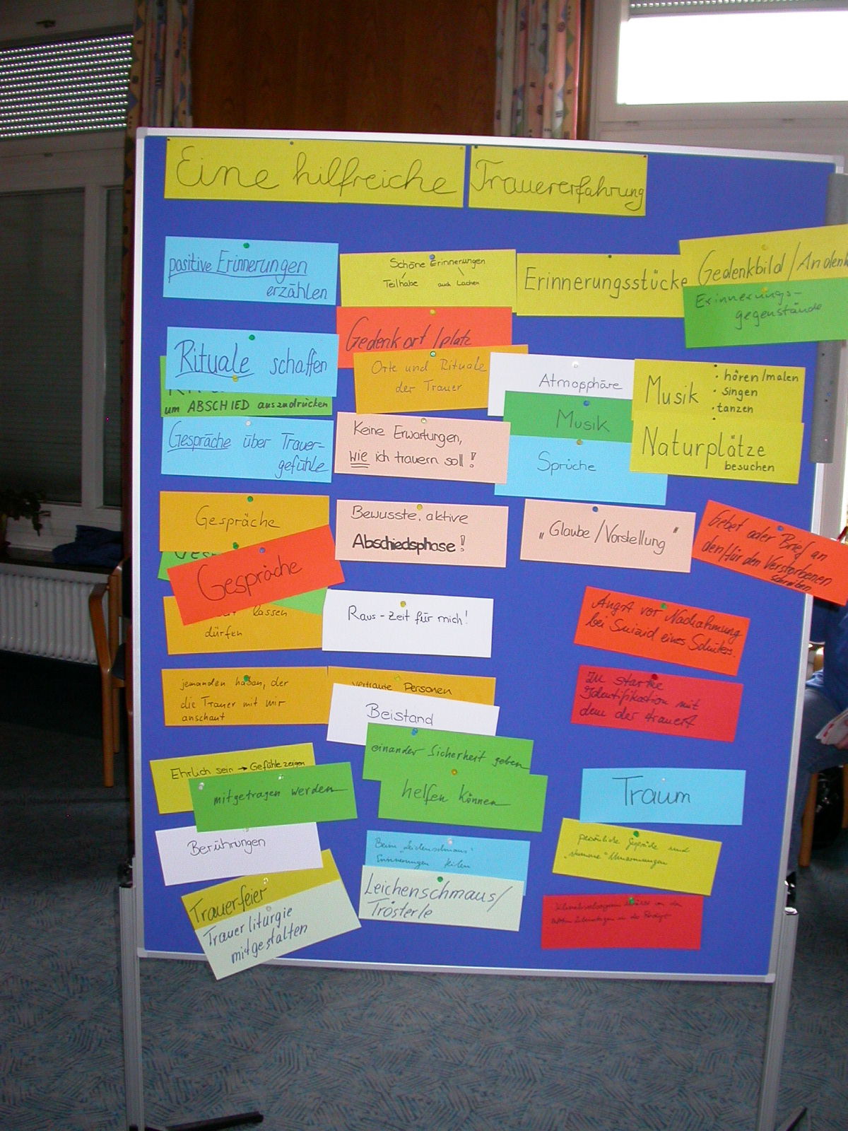 Kurzvorträge über Trauertheorien, Umgang mit Trauma, Krisenmanagement und Trauerrituale wechselten sich ab mit Einzel- und Gruppenarbeit über die Verarbeitung von Trauererfahrungen und das Gespräch in einer betroffenen Schulklasse. Ein Trauerritual sowie eine Wortgottesdienst mit Symbolen der Hoffnung und ein Friedhofsgang wurden praktisch durchgeführt. Auch die unterstützenden Systeme wie die staatliche Schulberatung (KIBBS), ökumenische Notfallseelsorge (NFS) und Krisenseelsorge im Schulbereich (KiS) stellten sich mit ihren Verantwortlichen vor und beschrieben an praktischen Beispielen ihr Zusammenwirken. Die Lehrerinnen und Lehrer bekamen Hilfestellung, um an ihrer Schule einen Krisenplan zu erarbeiten und ein Krisenteam einzurichten. Ein Büchertisch und Kurzfilme, die zum Teil betrachtet und diskutiert wurden, rundeten das Angebot ab.
