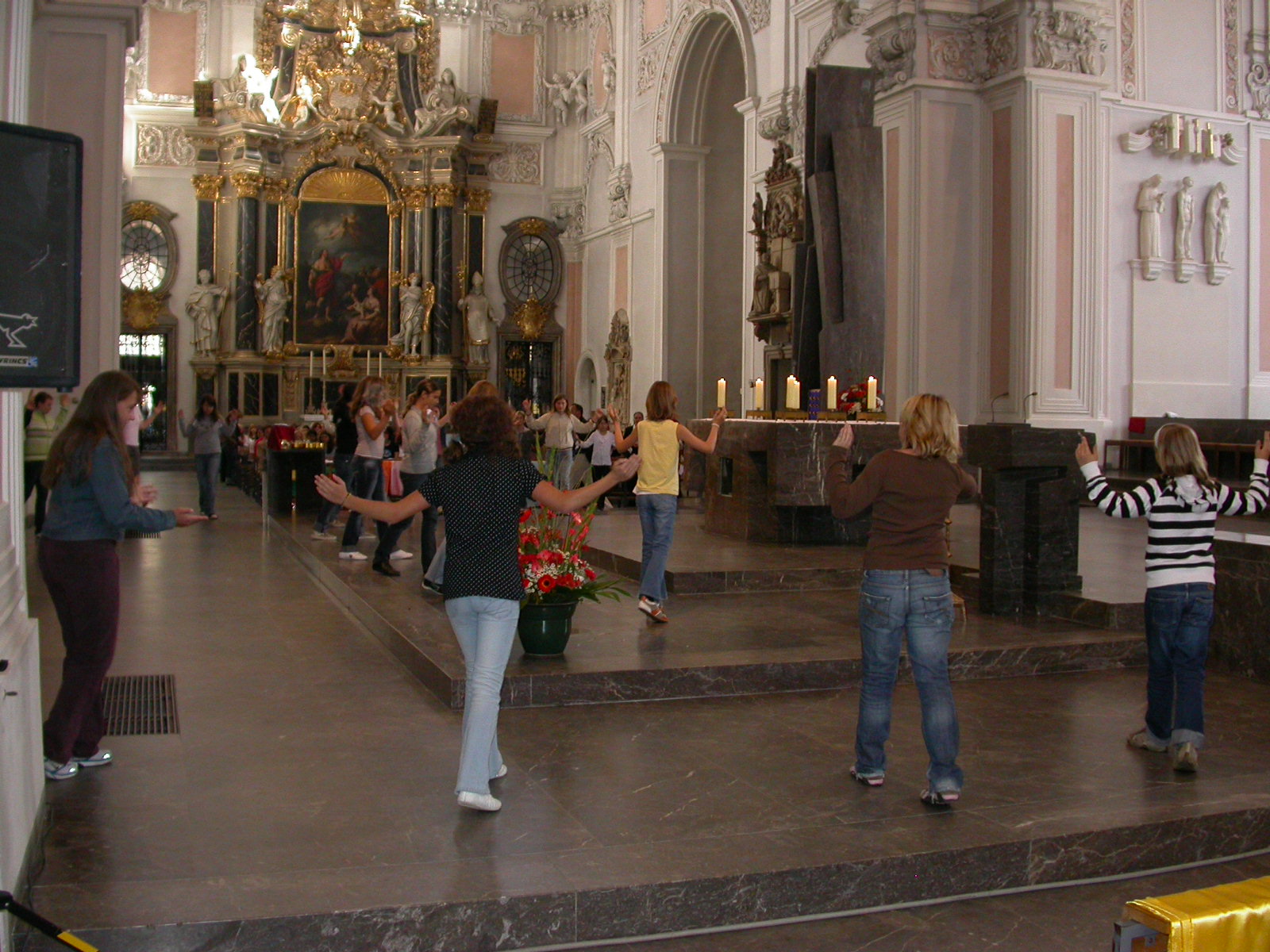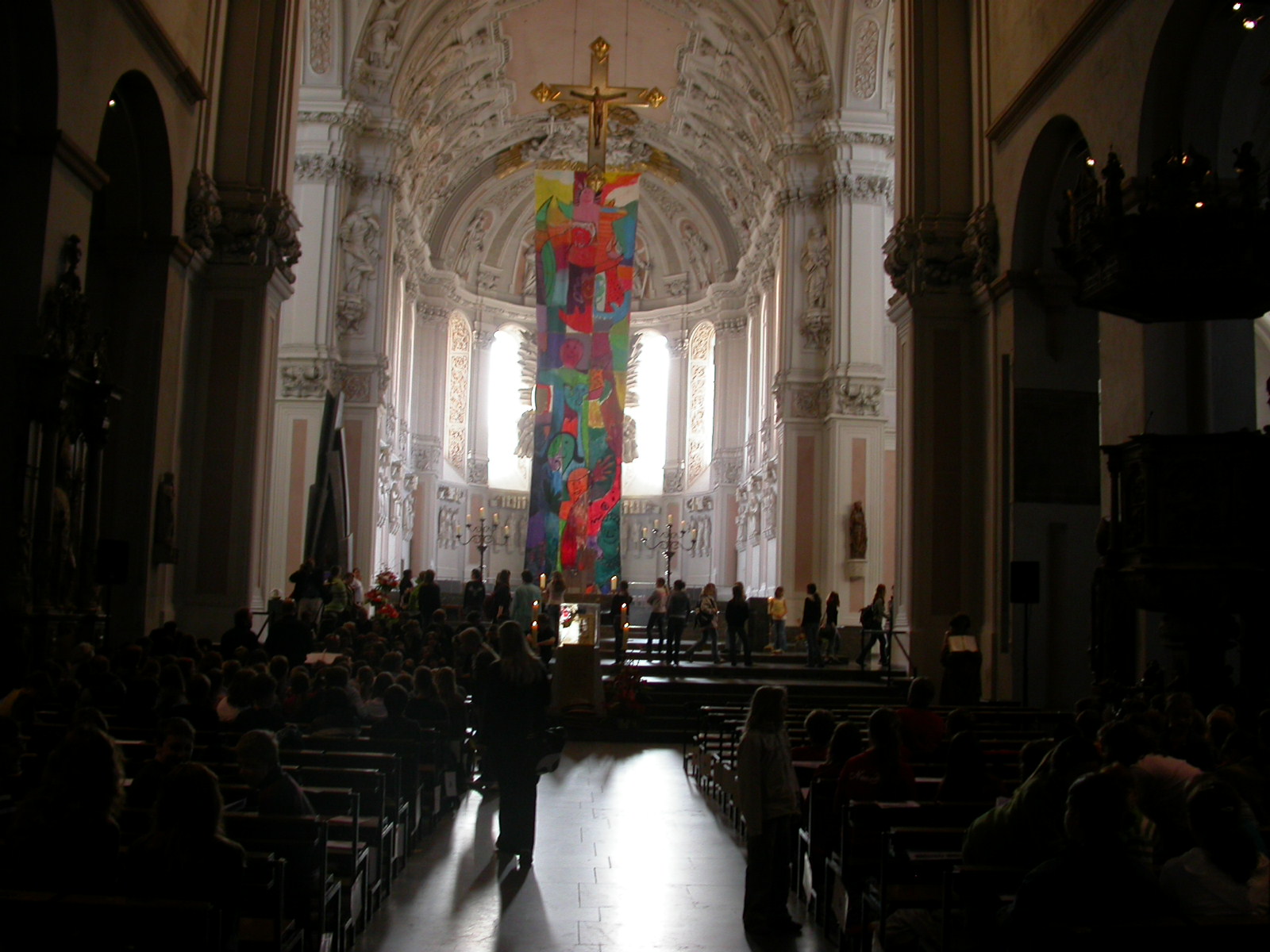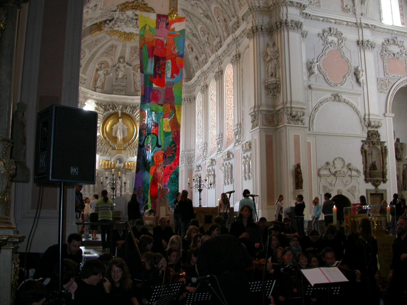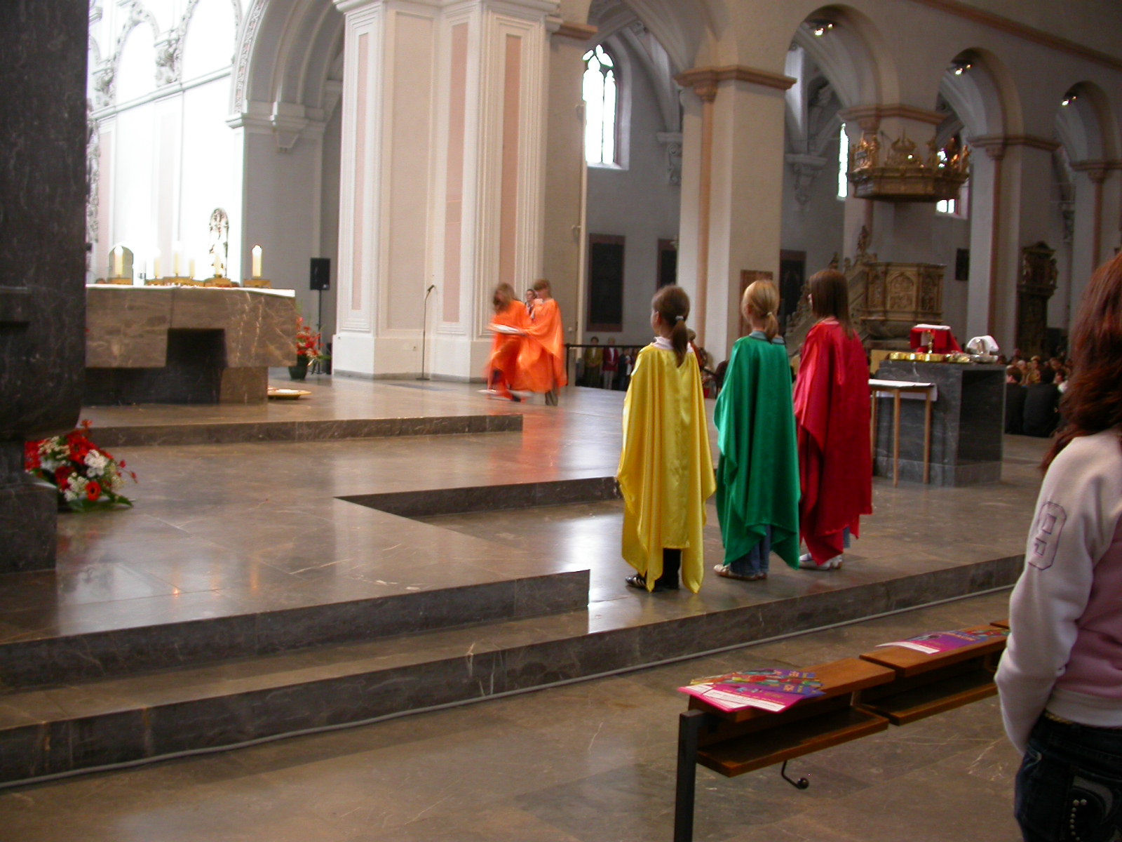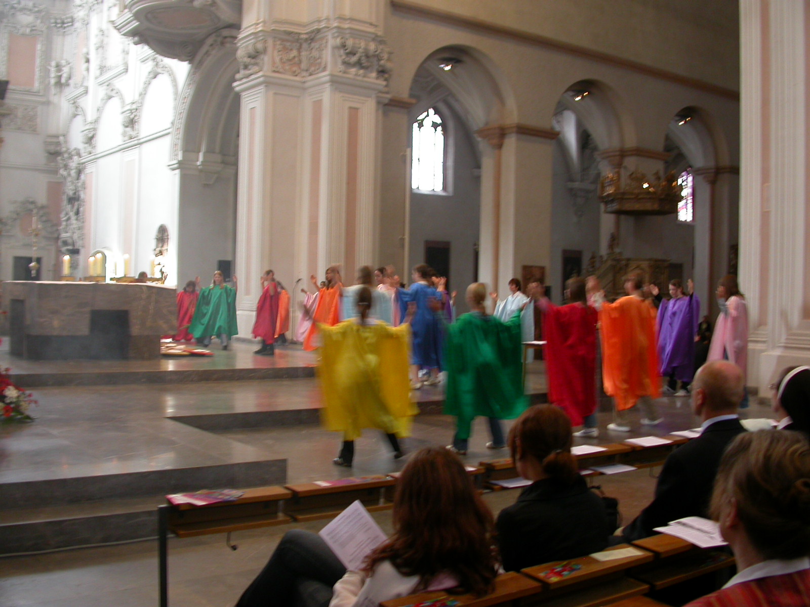 Die Fürbitten tragen Schülerinnen der Volkacher Mädchenrealschule vor. Währenddessen bringen Mitschülerinnen ihre ganz eigenen Bitten mit Körben voller Briefe zum Altar. Die Mädchen sind in bunte, glänzende Stoffe gehüllt, die sich mit ihrer satten Farbigkeit einreihen in die Komposition des Altarraumes. Nach den Fürbitten formieren sich die Schülerinnen. Ihre Gewänder beginnen im Takt zu schwingen. Leichtigkeit und Harmonie erfüllen den Raum. Mit ihrem liturgischen Tanz verleihen die Mädchen ihren Fürbitten einen noch tieferen Ausdruck. Obwohl über 1300 Menschen im Dom versammelt sind, ist es ganz still. Nur die Klänge der Instrumente und das Rauschen der Stoffe sind zu vernehmen. „Segne uns, dass wir ein Segen sind“, stimmt der Chor des Egbert-Gymnasiums an, und die Gemeinde singt aus voller Kehle mit. Was da mit modernen Rhythmen und mit deutschen, aber auch mit vielen lateinischen Texten erklingt, ist etwas ganz Besonderes: Es ist eine Welturaufführung.